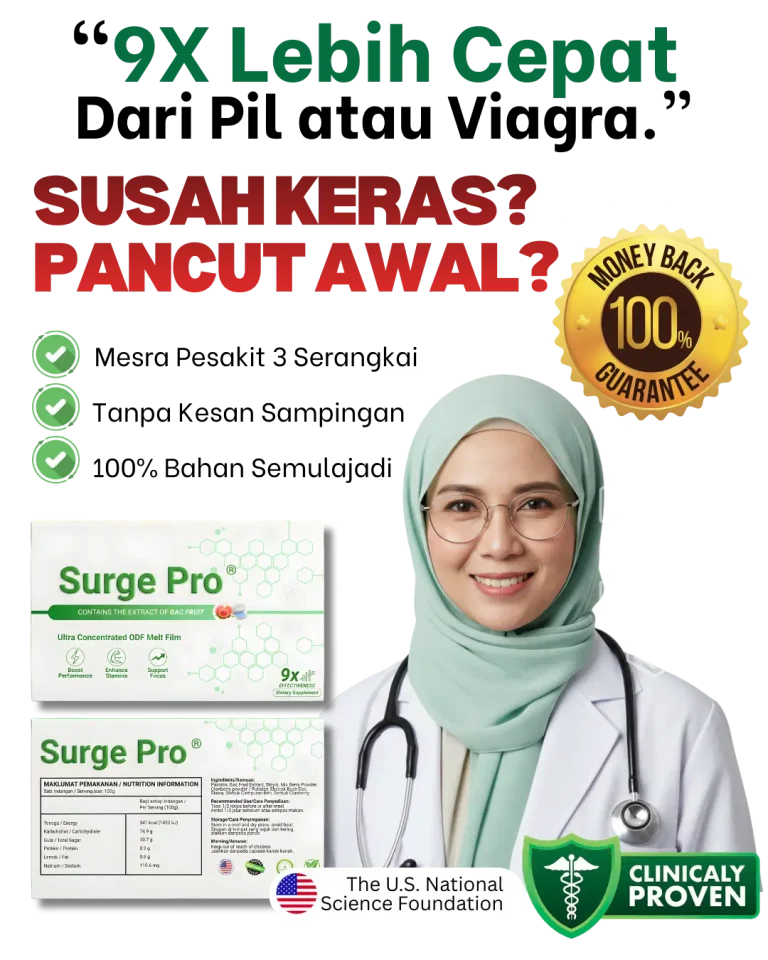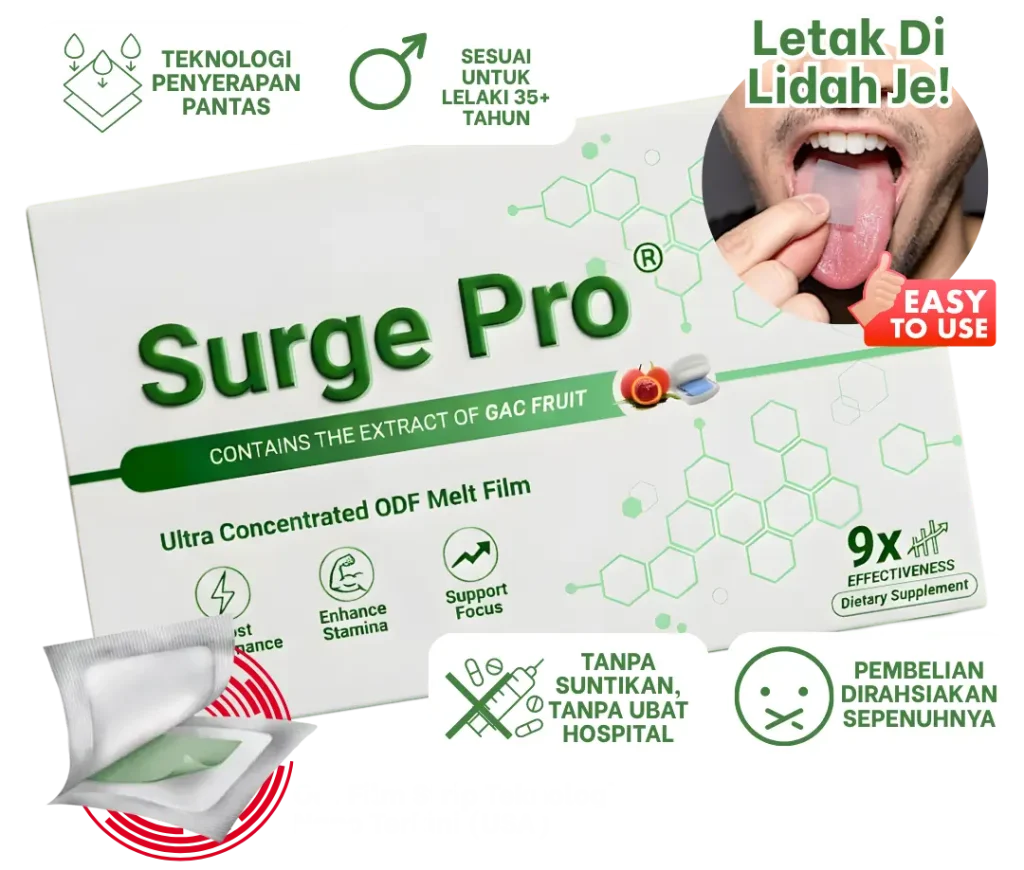 Surge Pro® adalah produk sokongan kesihatan. Jika anda mempunyai kondisi perubatan tertentu atau sedang mengambil ubat doktor, disarankan untuk mendapatkan nasihat profesional kesihatan sebelum penggunaan.